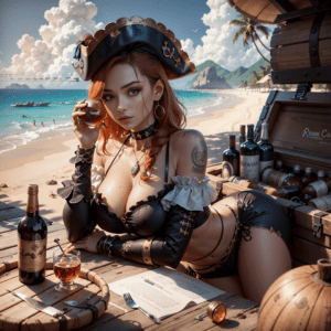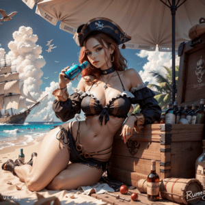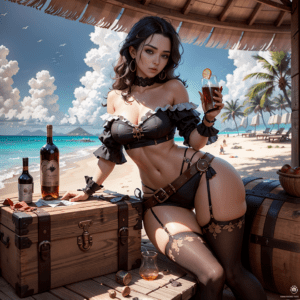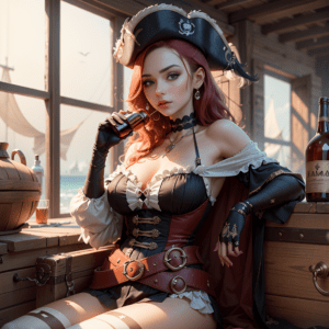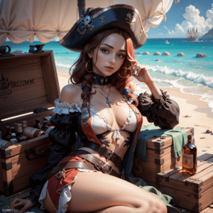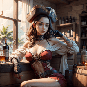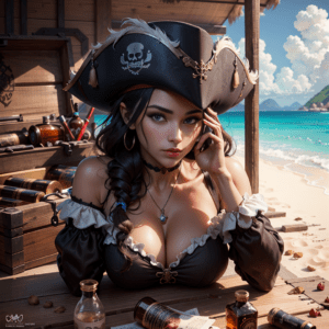 Her name is Isabella, a pirate of extraordinary charm and allure. With flowing tresses as dark as the midnight sky and eyes that sparkle like the Caribbean waters, she is a vision that stirs the hearts of both friend and foe. Her figure, graceful and curvaceous, carries the strength and resilience of a true pirate queen.